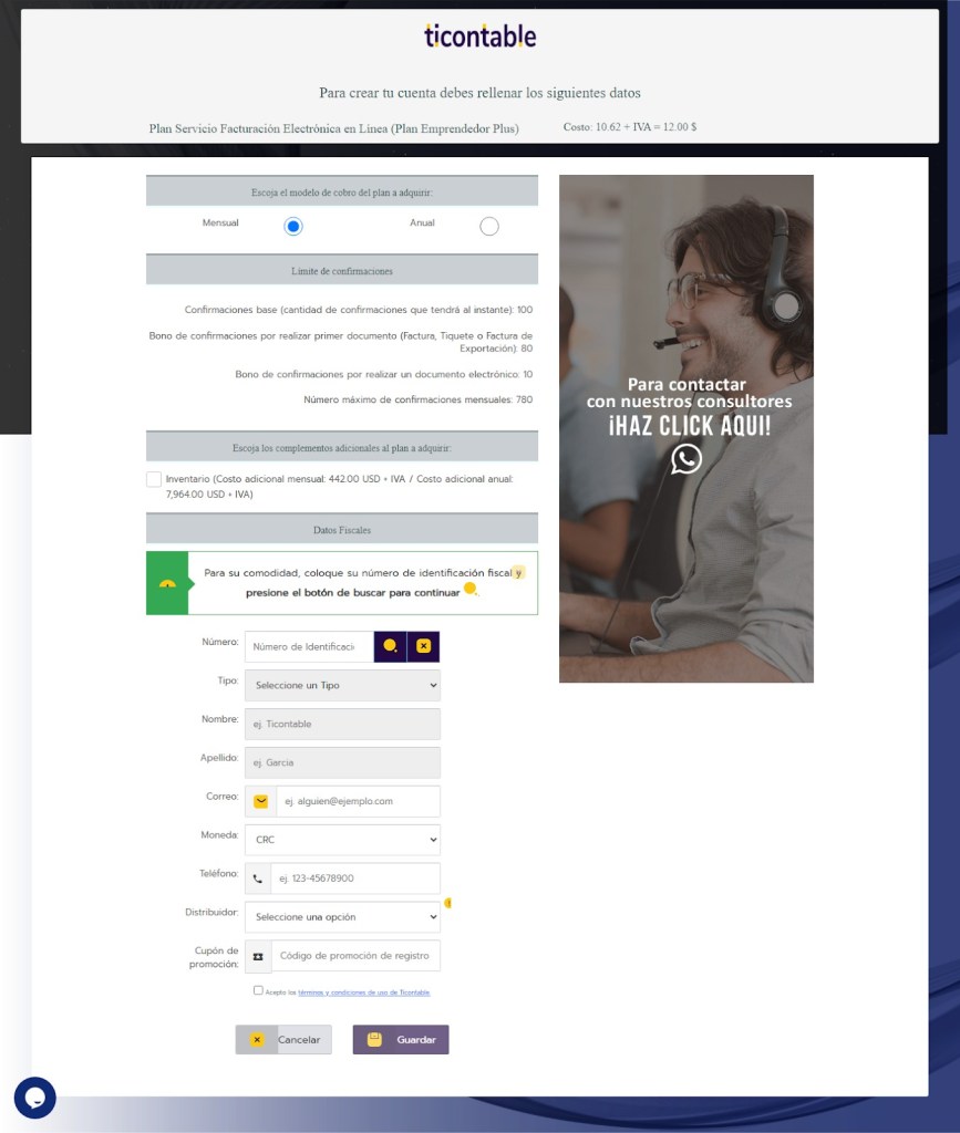 Podrá observar la siguiente pantalla de Registro, el ingreso de los datos será en un solo paso y si el plan elegido tiene la opción entre Mensual / Anual, usted puede seleccionar el modelo de cobro del plan y ver el Costo a pagar: