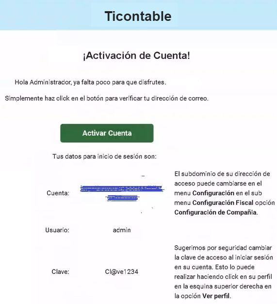 El sistema estará listo para funcionar. A la dirección de correo electrónico que proporcionó durante el registro, se le enviarán las credenciales de acceso a su cuenta de Ticontable: subdominio, usuario y contraseña.