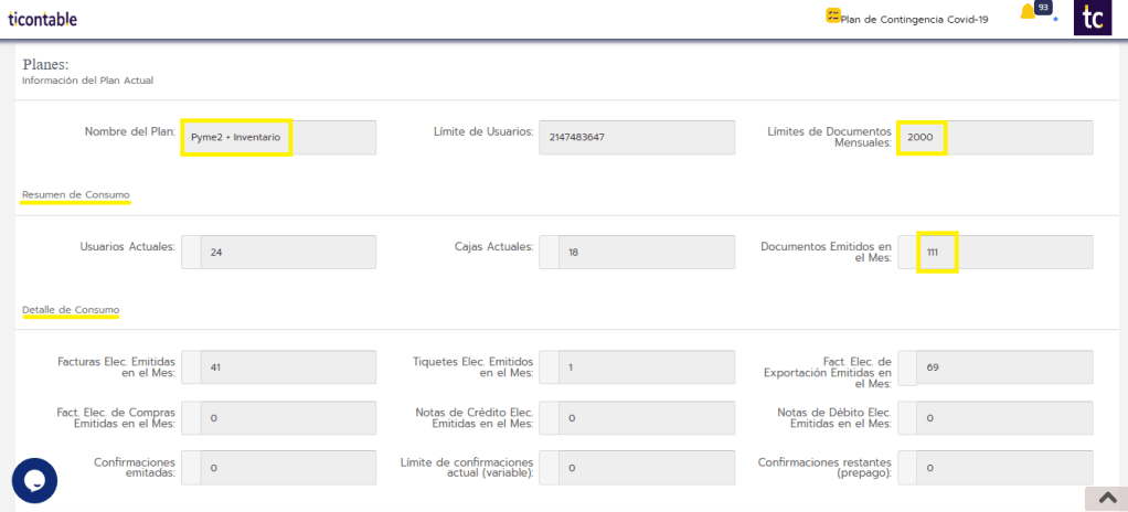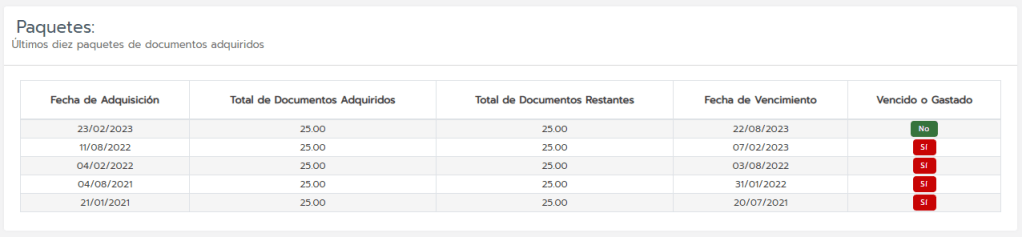 Asimismo, si ha adquirido algún paquete de documentos, podrá visualizar una tabla informativa con el total de documentos adquiridos, los documentos restantes, la fecha de vencimiento y el estado actual del paquete (vigente, vencido o agotado).