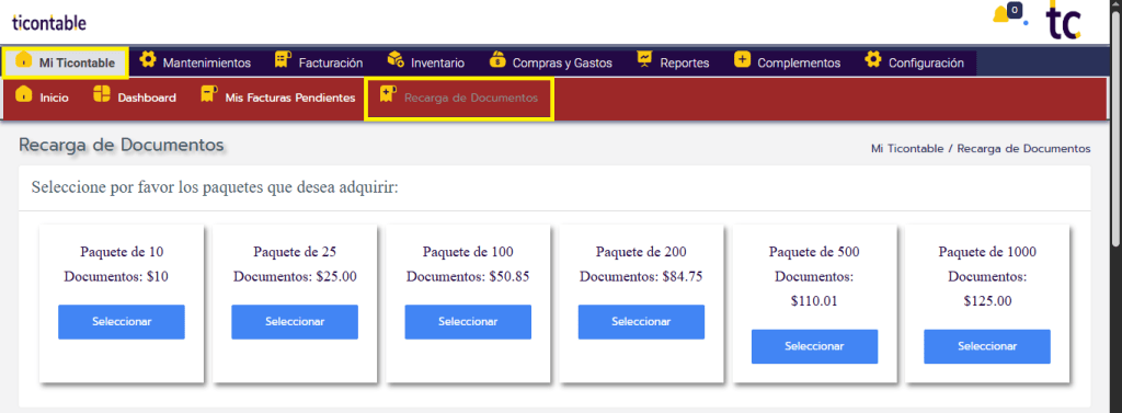 Accede al menú ‘Mi Ticontable‘ y haz clic en la opción ‘Recarga de Documentos‘.