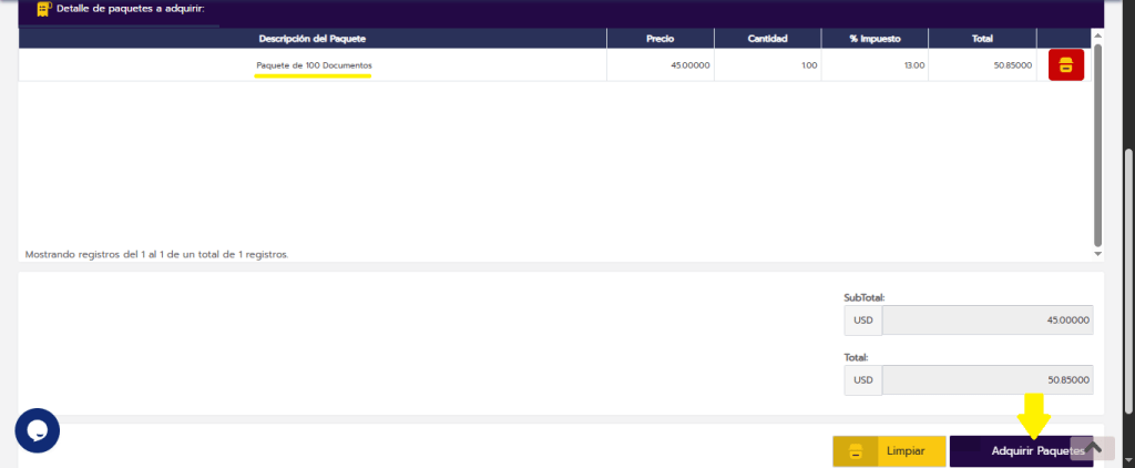 Elija el paquete que desea adquirir y haga clic en el botón ‘Adquirir Paquete’.