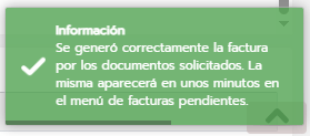 El sistema mostrará un mensaje informando que la factura se generó correctamente, y esta aparecerá en el menú ‘Mis Facturas Pendientes‘ , donde podrá proceder con el pago y el reporte del mismo.