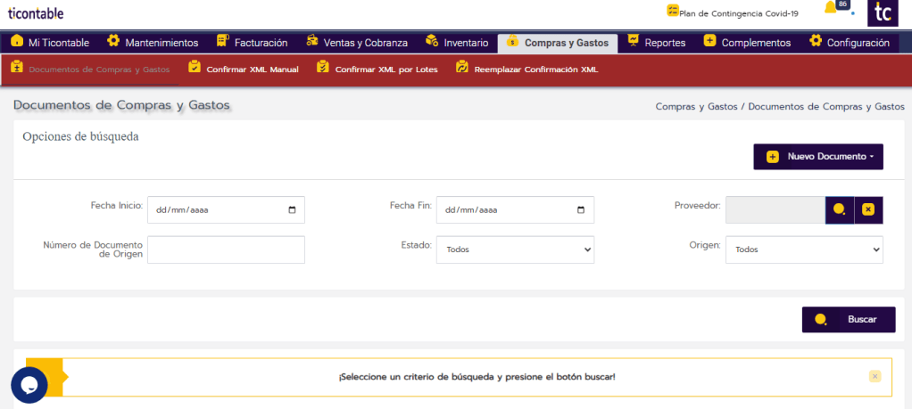 Haz clic en Documentos de Compras y Gastos. Al hacerlo, se mostrará la siguiente pantalla:
