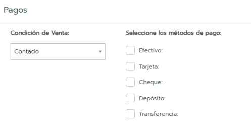 En la sección de Pagos, selecciona la Condición de Venta (Contado o Crédito) y elige el método de pago correspondiente (Efectivo, Tarjeta, Cheque, Depósito o Transferencia). Si es a crédito, indica los días de crédito.