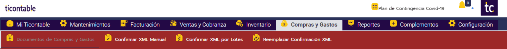 Una vez dentro de Compras y Gastos, verás estas opciones: Documentos de Compras y Gastos, Confirmar XML Manual, Confirmar XML por Lotes y Reemplazar Confirmación XML.