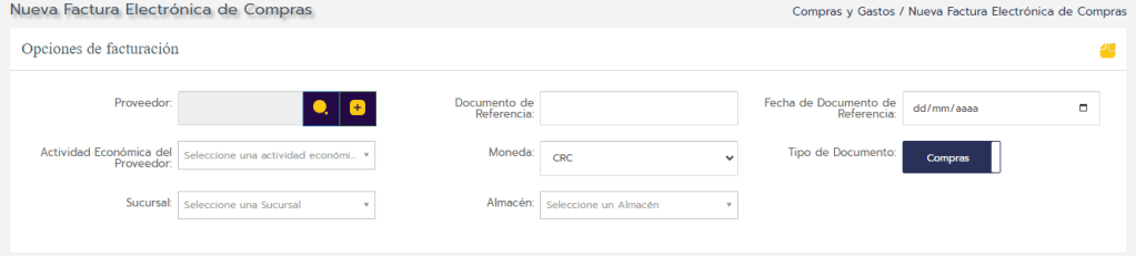 En la pantalla Nueva Factura Electrónica de Compras, dentro de la sección Opciones de facturación, verás los siguientes campos: Proveedor, Documento de Referencia, Fecha de Documento de Referencia, Actividad Económica del Proveedor, Moneda, Tipo de Documento, Sucursal y Almacén.