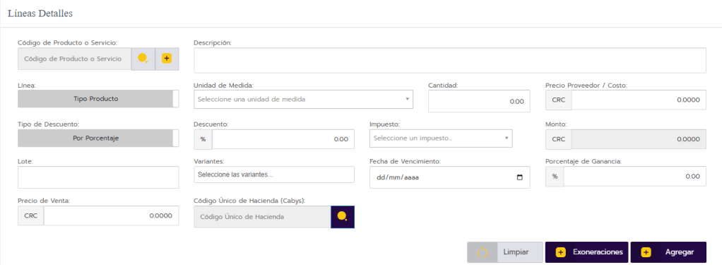 En la sección Líneas de Detalles, podrás ingresar la información de los productos o servicios que deseas incluir en la factura de compras. Al igual que con el proveedor, puedes seleccionar elementos ya registrados en tu sistema Ticontable o crear nuevos de forma rápida. También podrás definir cantidades, precios, descuentos, impuestos y otros datos importantes.