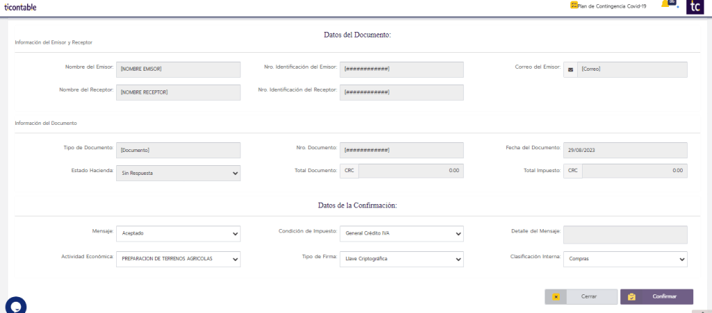 Debe configurar los campos correspondientes con los Datos de la Confirmación: