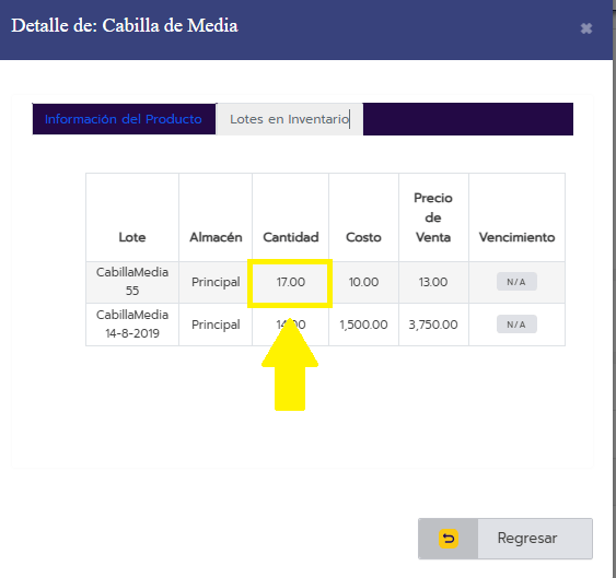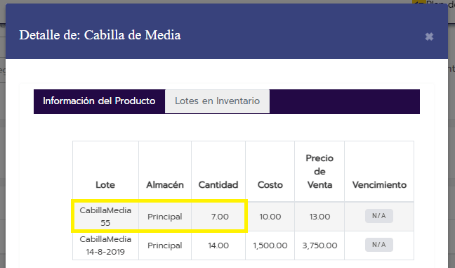 Podemos observar que el producto ya tiene un lote previamente creado con una cantidad de 15 unidades, ubicado en el almacén principal. Esta información puede consultarla desde el apartado Mantenimientos > Productos.