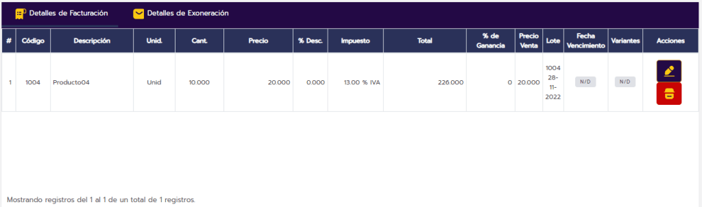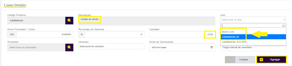 Una vez agregado, podrá observar los detalles del producto en la sección correspondiente, donde se reflejará la nueva cantidad asignada al lote y los datos actualizados del inventario.