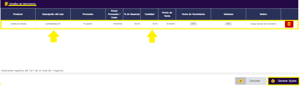 Una vez seleccionado el lote existente, debe hacer clic en el botón Agregar. Luego, podrá observar los Detalles de Movimiento y, por último, hacer clic en el botón Generar Ajuste para completar el proceso.