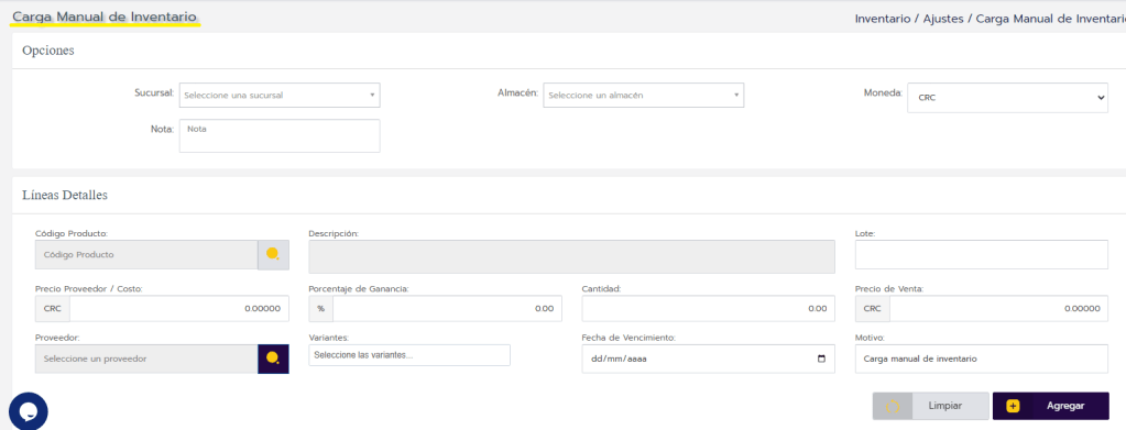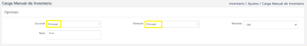 En la ventana de Carga Manual de Inventario, se mostrarán los campos Sucursal, Almacén y Moneda, los cuales debe seleccionar según corresponda. Una vez completados, podrá ingresar los detalles del producto que desea agregar al inventario.